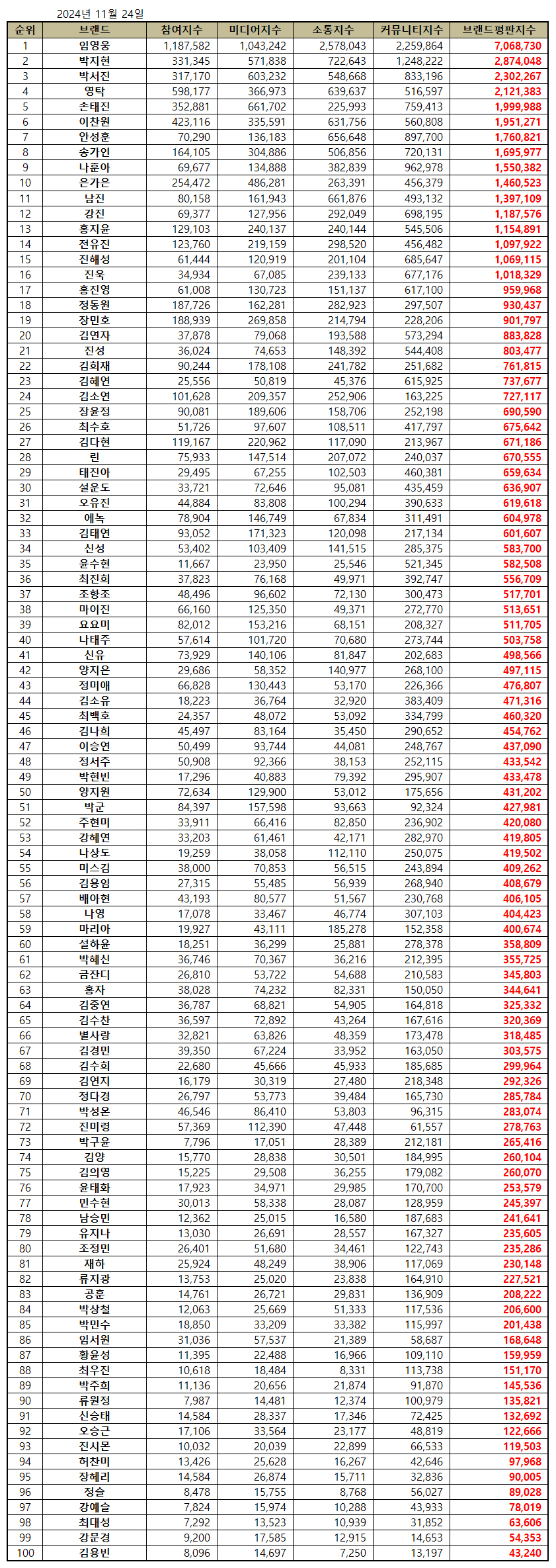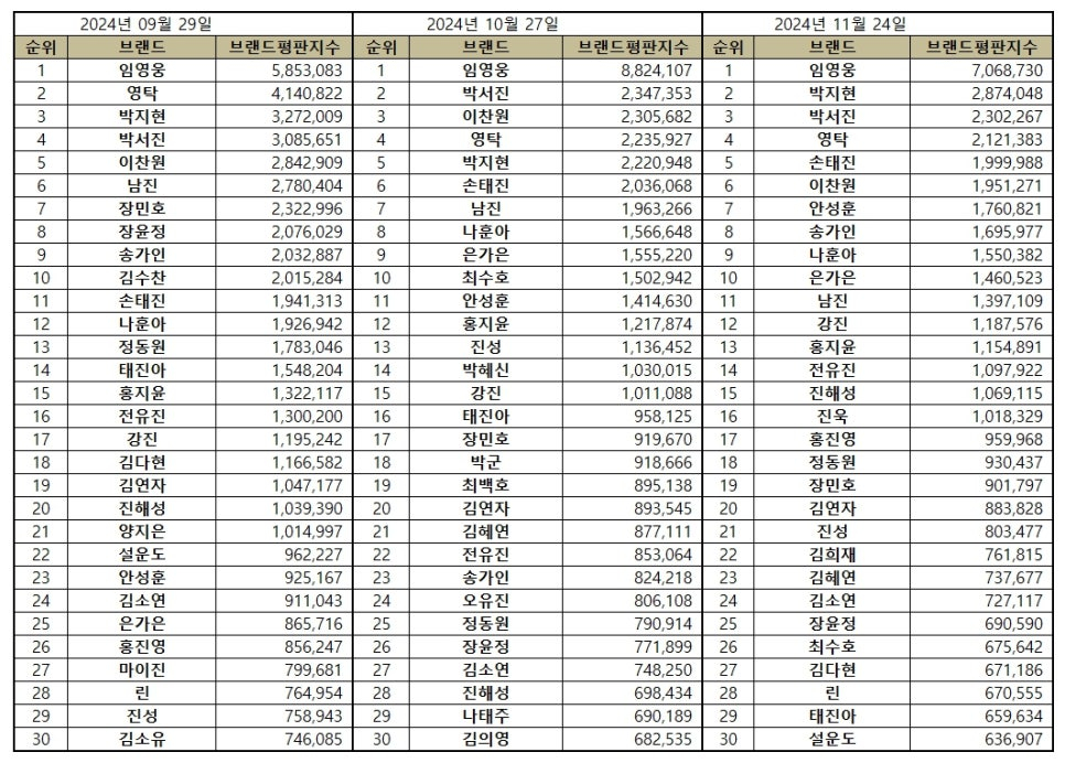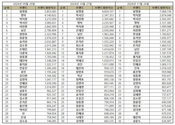 2024년 11월 트로트 가수 브랜드평판 30위 순위는 임영웅, 박지현, 박서진, 영탁, 손태진, 이찬원, 안성훈, 송가인, 나훈아, 은가은, 남진, 강진, 홍지윤, 전유진, 진해성, 진욱, 홍진영, 정동원, 장민호, 김연자, 진성, 김희재, 김혜연, 김소연, 장윤정, 최수호, 김다현, 린, 태진아, 설운도 순으로 분석됐다.