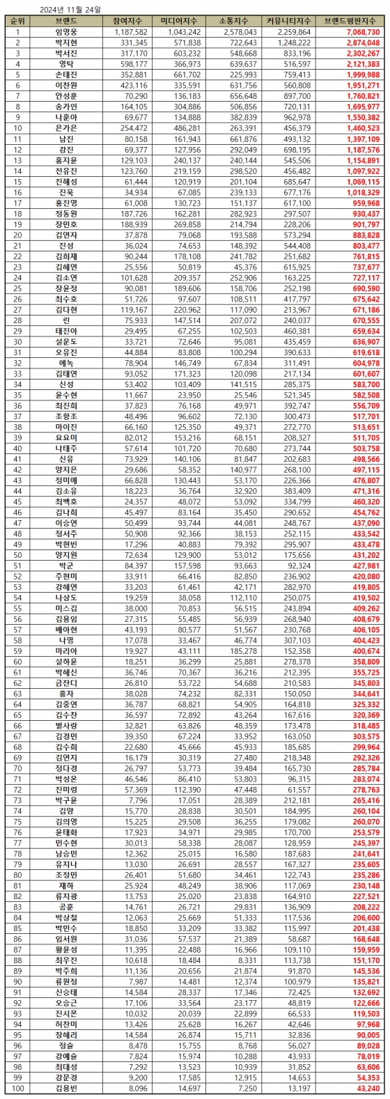 임영웅은 11월 24일 한국기업평판연구소가 발표한 트로트 가수 브랜드평판 2024년 11월 빅데이터 분석결과, 1위를 차지했다. 47개월 연속 1위 대기록이다. 임영웅에 이어 2위 박지현, 3위 박서진, 4위 영탁, 5위 손태진 순이었다.