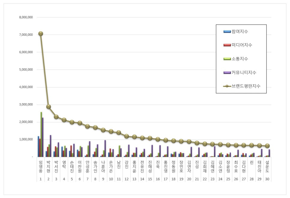 트로트 가수 브랜드평판 1위를 기록한 임영웅 브랜드는 참여지수 1,187,582 미디어지수 1,043,242 소통지수 2,578,043 커뮤니티지수 2,259,864가 되면서 브랜드평판지수 7,068,730으로 분석됐다.