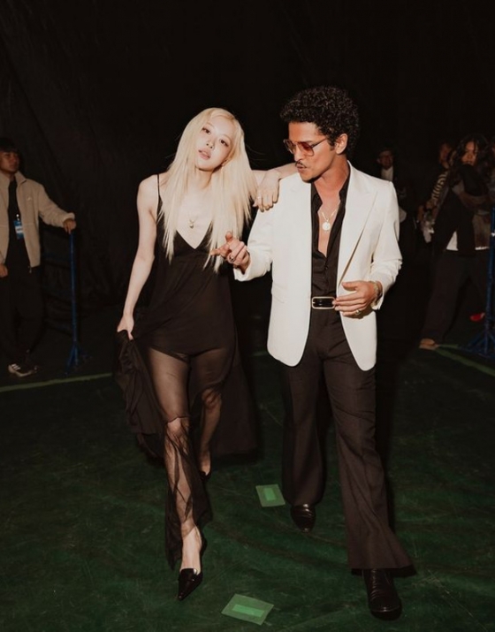 공개된 사진 속엔 로제와 브루노 마스가 무대 뒤편에서 걸어가는 모습이다. 두 사람은 히트곡 'APT.'(아파트) 발매 이후 함께 있는 모습을 자주 보이며 친분을 드러내고 있다.