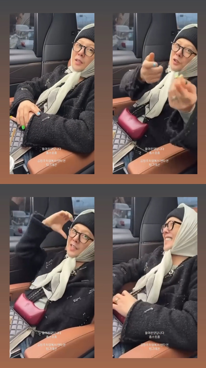24일 오후 지드래곤은 개인 SNS 부계정에 "돌아온댔답니다. 홈스윗홈. 공항 주차장에서 현타 온 빙그래곤"이라며 동영상을 게재했다.