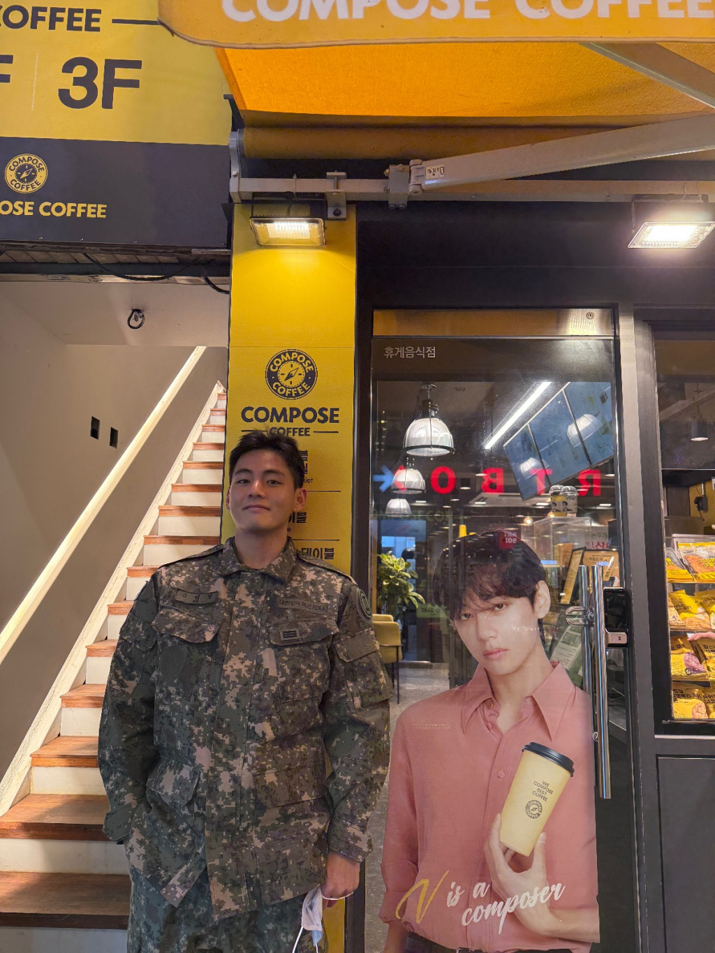 사진 속 뷔는 자신이 모델로 활동 중인 한 커피 브랜드 매장 앞에서 군복을 입은 채 늠름한 자태를 뽐내고 있는 모습. 그는 입대 전과 비교했을 때 확연히 다른 피지컬로 보는 이들을 깜짝 놀라게 만들었다.