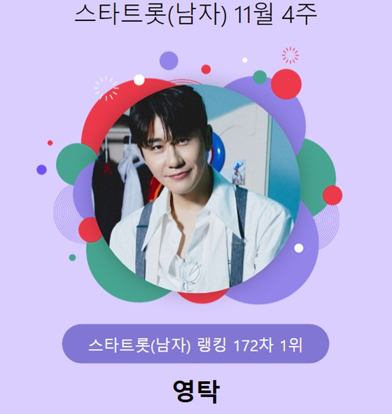 영탁은 지난 21일 오후 3시 1분부터 28일 오후 3시까지 진행된 11월 4주(172차) 스타랭킹 스타트롯 남자 랭킹에서 1위에 올랐다. 그는 8만9338표를 얻었다.