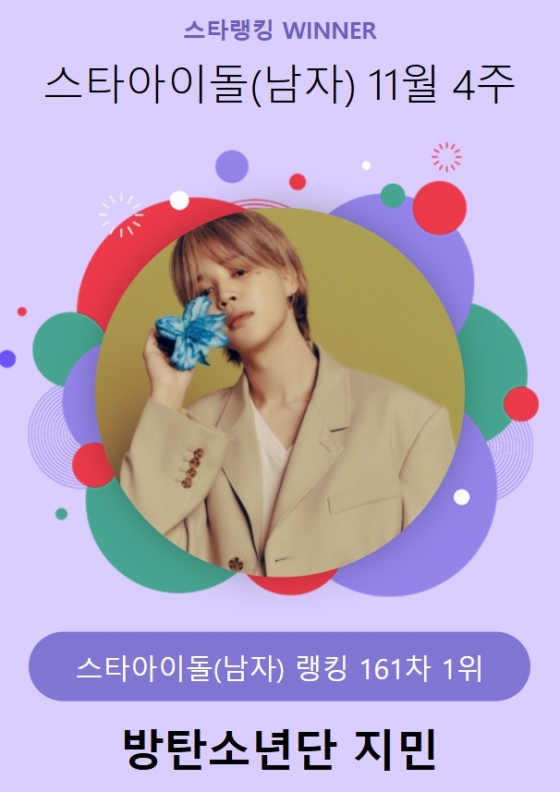 지민은 지난 21일 오후 3시 1분부터 28일 오후 3시까지 진행된 11월 4주(161차) 스타랭킹 스타아이돌 남자 랭킹 투표에서 2PM 준호, 진을 꺾고 1위를 차지했다.