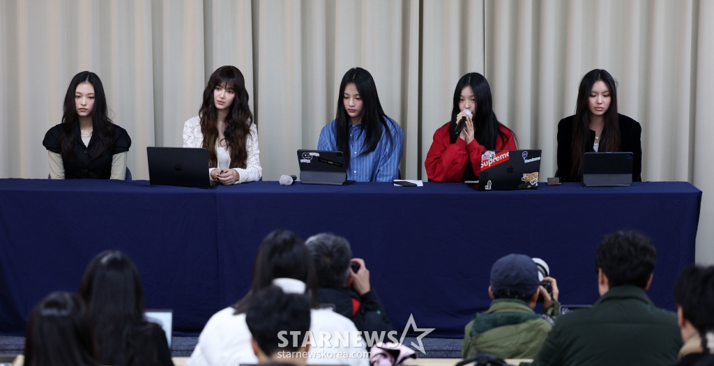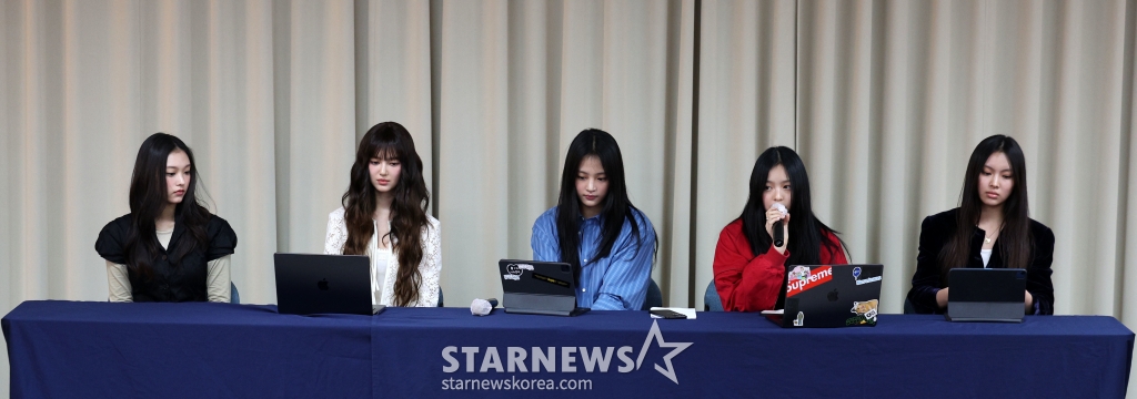뉴진스(민지, 하니, 다니엘, 해린, 혜인)는 28일 오후 서울 강남구 삼성동 스페이스쉐어 삼성역센터에서 전속 계약 해지 관련 긴급 기자회견을 개최했다.