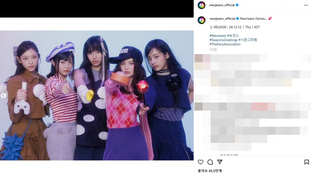 어도어 측은 29일 뉴진스 공식 인스타그램 계정에 "NewJeans Fairies.. RELEASE : 24.12.12.ㅣThuㅣKST #NewJeans #뉴진스 #SeasonsGreetings #시즌그리팅 #TheFairyAssociation"이란 글과 함께 뉴진스의 시즌그리팅 사진을 공개했다.