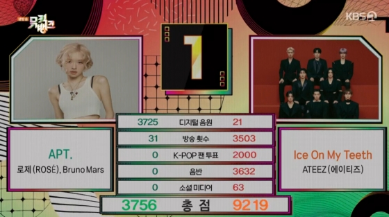 에이티즈가 로제를 꺾고 '뮤직뱅크' 1위에 올랐다.