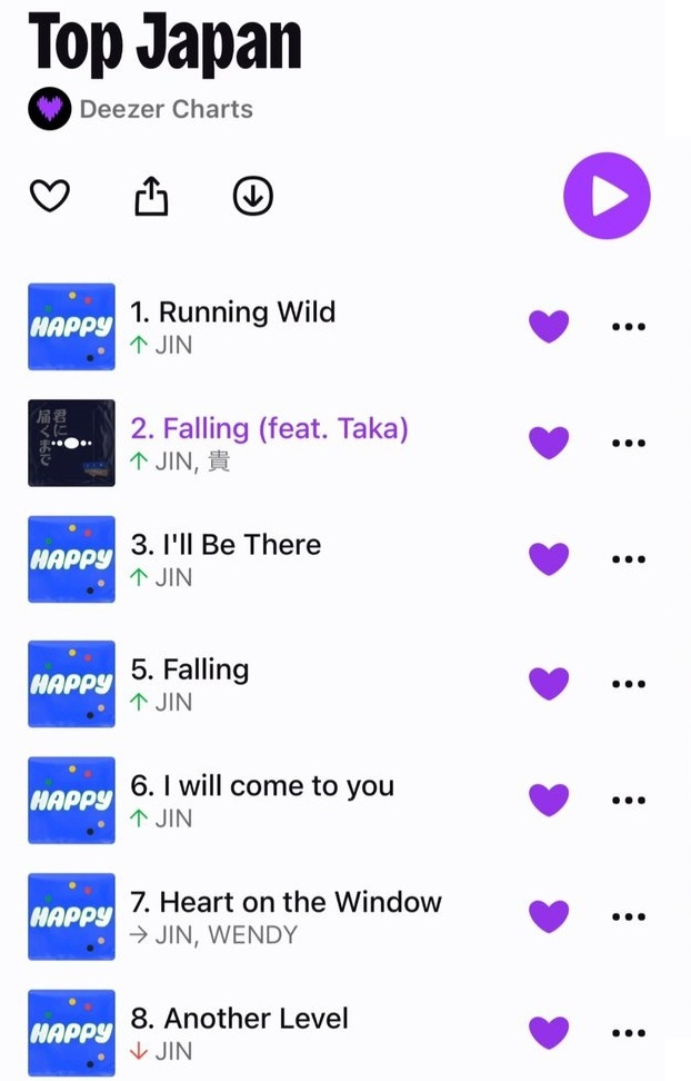 진은 지난 29일 발표된 글로벌 스트리밍 플랫폼 '디저'(deezer) 재팬 탑100(JAPAN Top100) 차트에서도 'Happy'의 곡들과 그동안 발표했던 솔로곡들을 1위부터 줄세우며 최고의 파워를 보였다. 1위는 타이틀곡 'Running Wild'(러닝 와일드), 2위 '네게 닿을 때까지' (feat.Taka) 3위 선공개곡 'I'll Be There'(아일 비 데어), 5위 '네게 닿을 때까지', 6위 '그리움에', 7위 Heart on the Window(하트 온 더 윈도우), 8위 Another Level(어나더 레벨) 등이었다.