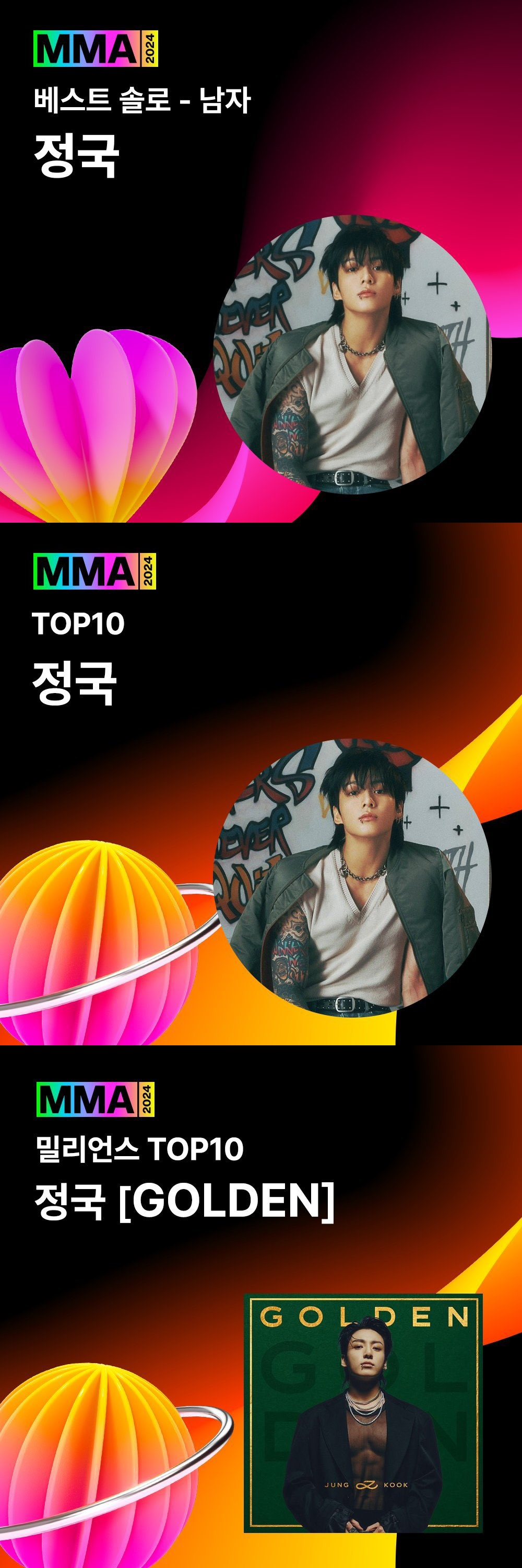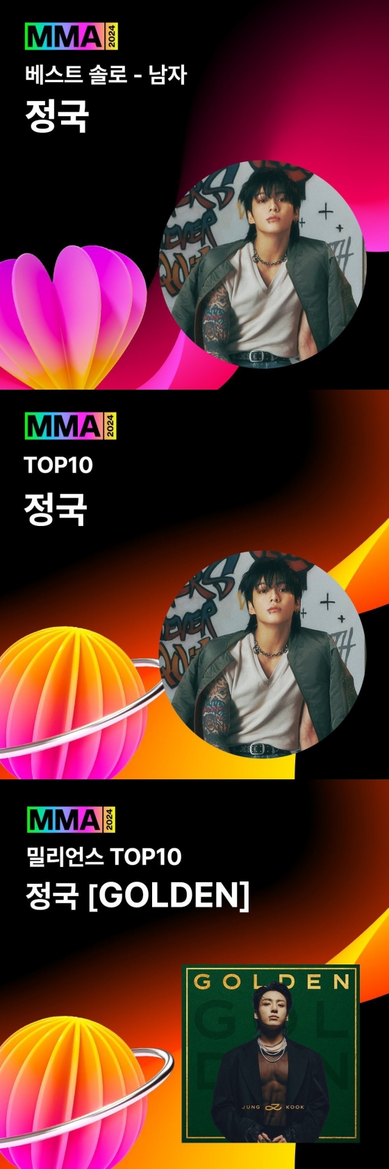 정국은 지난 '2024 MAMA AWARDS'에서 '베스트 남성 아티스트', '베스트 댄스 퍼포먼스 남성 솔로', '팬스 초이스 남성 톱 10' 등 3관왕을 차지한 바 있다.