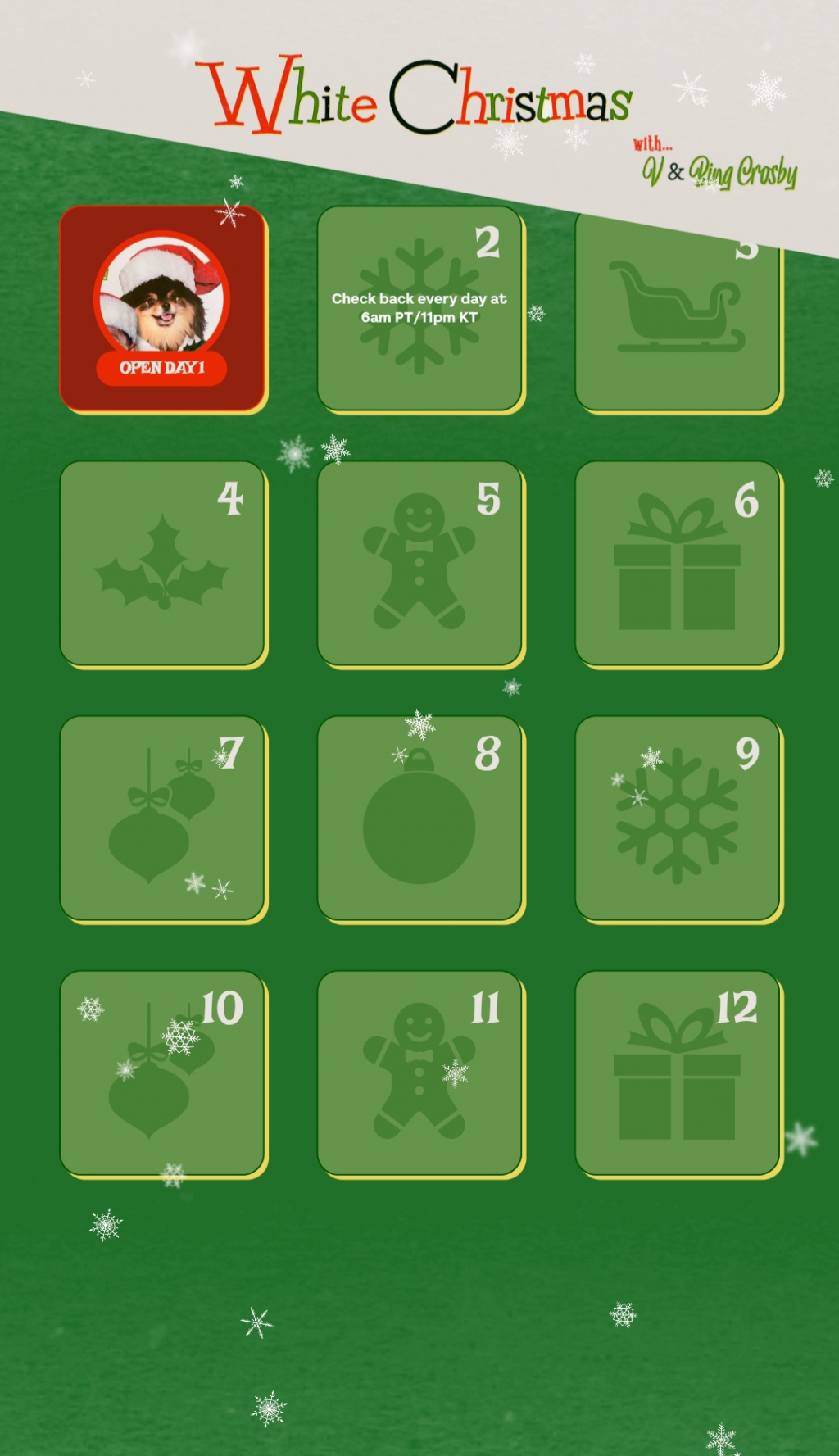 첫 번째 항목을 클릭하면 뷔가 부른 곡의 첫 소절을 감상할 수 있다. 비록 짧은 구간이지만 그의 매력적인 중저음 목소리가 귀를 사로잡는다. 이달 12일까지 해당 홈페이지를 통해 뷔와 빙 크로스비 소속사가 함께 준비한 특별한 콘텐츠가 공개된다.