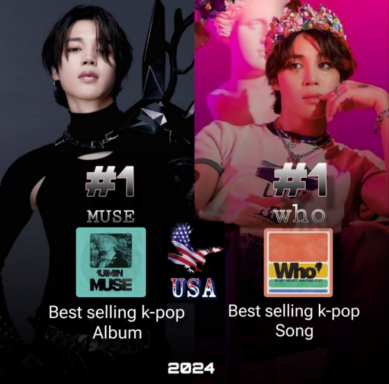 2024년 7월 19일 발매된 지민의 솔로 2집 타이틀 '후(Who)'가 2024년 11월 현재까지 미국에서 가장 많이 판매된 K팝 1위를 차지하며 지난해 1위였던 지민의 솔로 1집 타이틀 '라이크 크레이지(Like Crazy)'의 영광을 2년 연속 이어갔다.