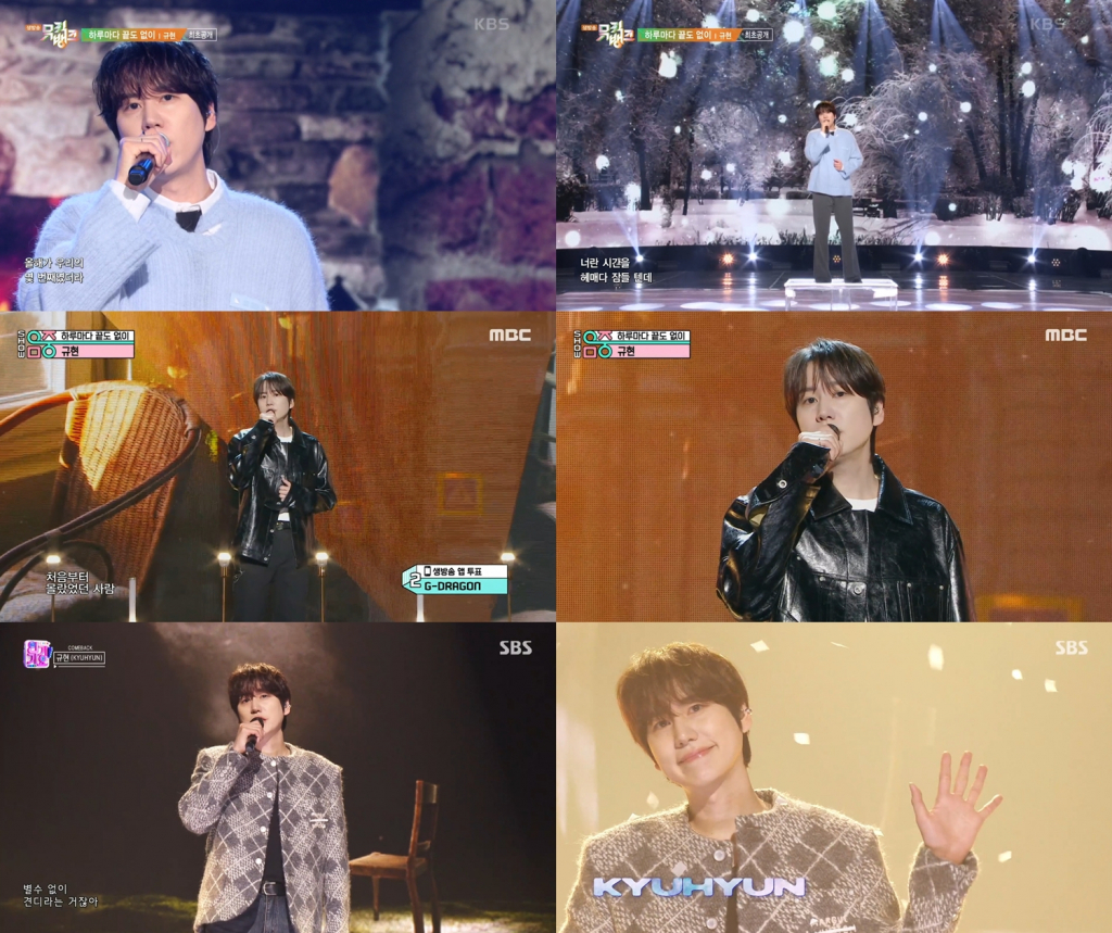 규현은 지난달 27일 정규 앨범 'COLORS(컬러스)'를 발매한 가운데, 11월 29일 KBS 2TV '뮤직뱅크'를 시작으로 MBC '쇼! 음악중심', SBS '인기가요'에 출연해 타이틀곡 '하루마다 끝도 없이 (Unending Days)' 컴백 무대를 가졌다.