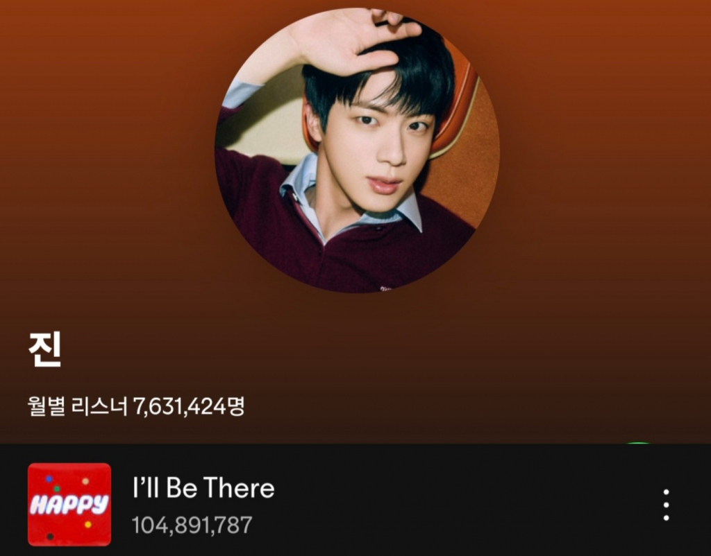 진의 첫 솔로 앨범 'Happy'(해피)의 선공개곡 'I'll Be There'는 최근 세계 최대 음원 플랫폼 스포티파이(Spotify)에서 최근 누적 스트리밍 수 1억을 돌파했다. 'I'll Be There'는 12월 2일 기준 총 1억 489만 건 이상의 스트리밍을 기록했다.