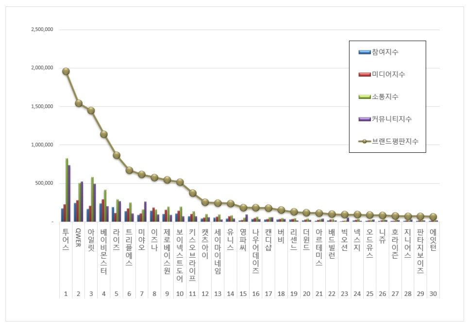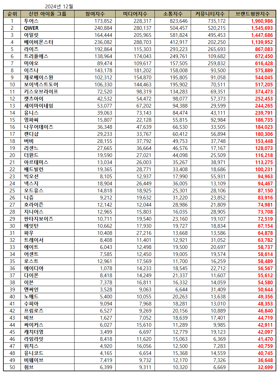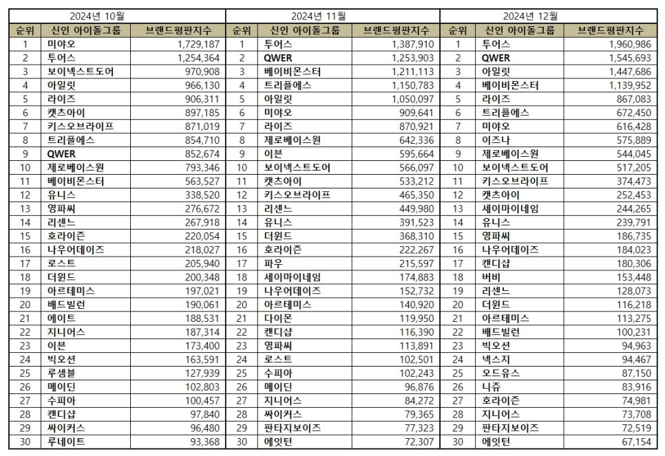 2024년 12월 신인 아이돌그룹 브랜드평판 30위 순위는 투어스, QWER, 아일릿, 베이비몬스터, 라이즈, 트리플에스, 미야오, 이즈나, 제로베이스원, 보이넥스트도어, 키스오브라이프, 캣츠아이, 세이마이네임, 유니스, 영파씨, 나우어데이즈, 캔디샵, 버비, 리센느, 더윈드, 아르테미스, 배드빌런, 빅오션, 넥스지, 오드유스, 니쥬, 호라이즌, 지니어스, 판타지보이즈, 에잇턴 순으로 분석됐다.