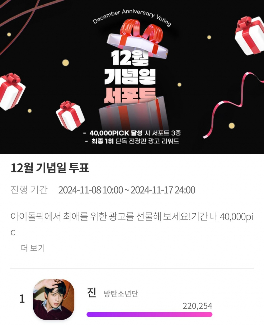 방탄소년단(BTS) 진이 '12월 기념일 서포트' 1위에 오르며 독보적 존재감을 빛냈다.