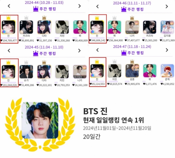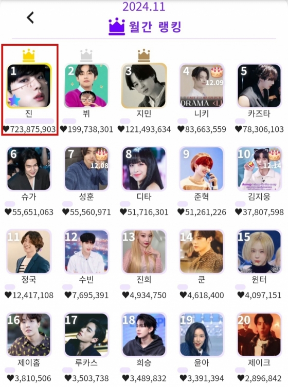 진은 K팝 아이돌 인기차트 앱 '케이돌'(KDOL)에서 진행된 11월 월간랭킹에서 7억 2387만 5903개의 하트 수를 기록하며 압도적인 표수로 1위에 올랐다.