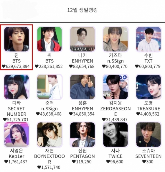 진은 10월 20일부터 11월 16일까지 진행된 12월 생일랭킹에서도 6억 3967만 3894개의 하트를 획득하며 1위를 차지했다.