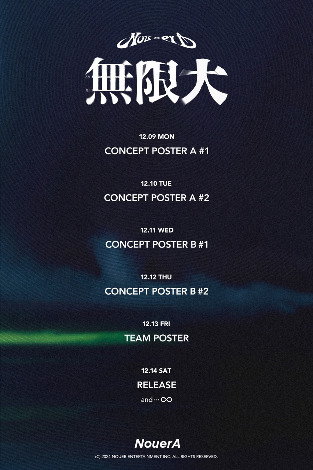 누에라는 13일에는 무한한 시너지를 품은 단체 콘셉트 포토를 선물하며 강렬한 이미지를 선사할 계획. 그리고 14일 글로벌 팬들에게 전하는 누에라의 첫 선물 '무한대(無限大)'가 정식으로 선발매된다.