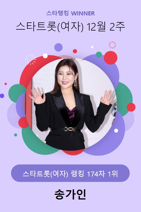 송가인은 지난 5일 오후 3시 1분부터 12월 12일 오후 3시까지 진행된 12월 2주(174차) 스타랭킹 스타트롯 여자 부문 랭킹 부문에서 1위를 지켰다.