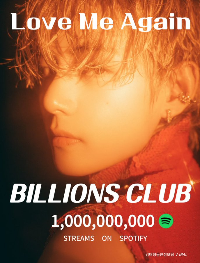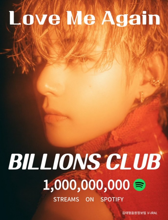 방탄소년단(BTS) 뷔의 '러브 미 어게인'(Love Me Again)이 스포티파이(Spotify)에서 10억 스트리밍을 돌파하며 인기를 빛냈다.