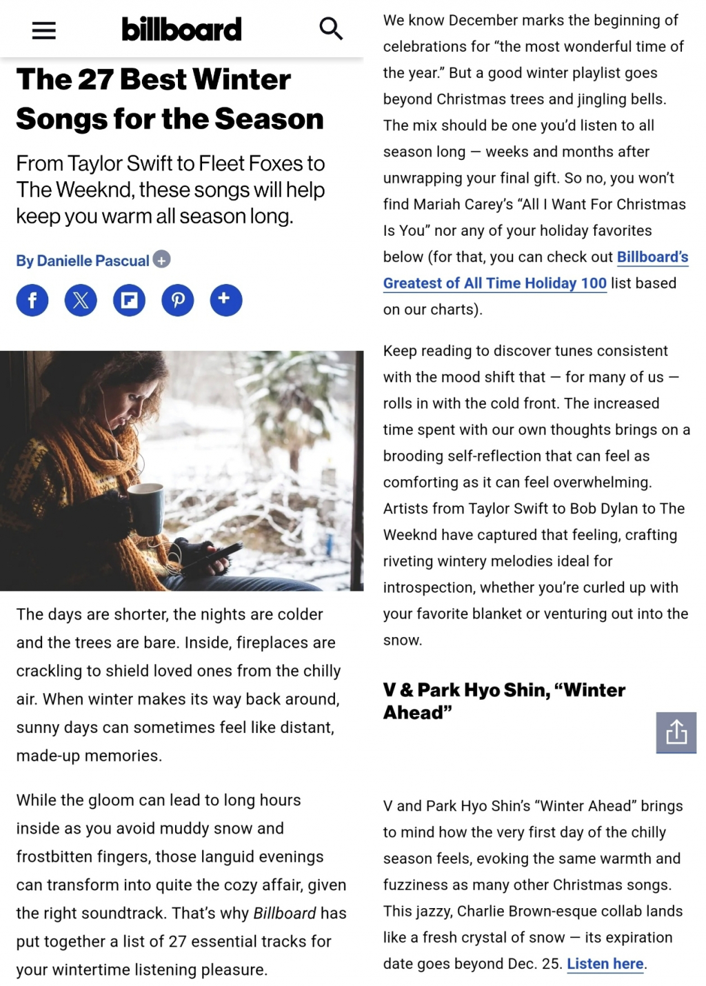방탄소년단(BTS) 뷔의 'Winter Ahead'가 빌보드가 선정한 '베스트 윈터 송 27'에 선정되며 인기를 빛냈다.