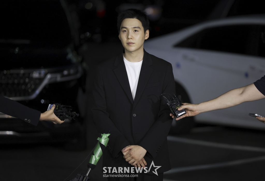 결국 슈가는 사건 17일 만인 8월 23일 오후 7시 40분께 조사를 받기 위해 서울 용산경찰서에 출석했다. 검은 정장 차림으로 포토라인에 선 그는 "굉장히 죄송하다. 많은 팬분들에게 정말 큰 실망을 안겨드린 점, 진심으로 반성하고 있다. 성실히 조사에 임하고 오겠다"고 말했다.
