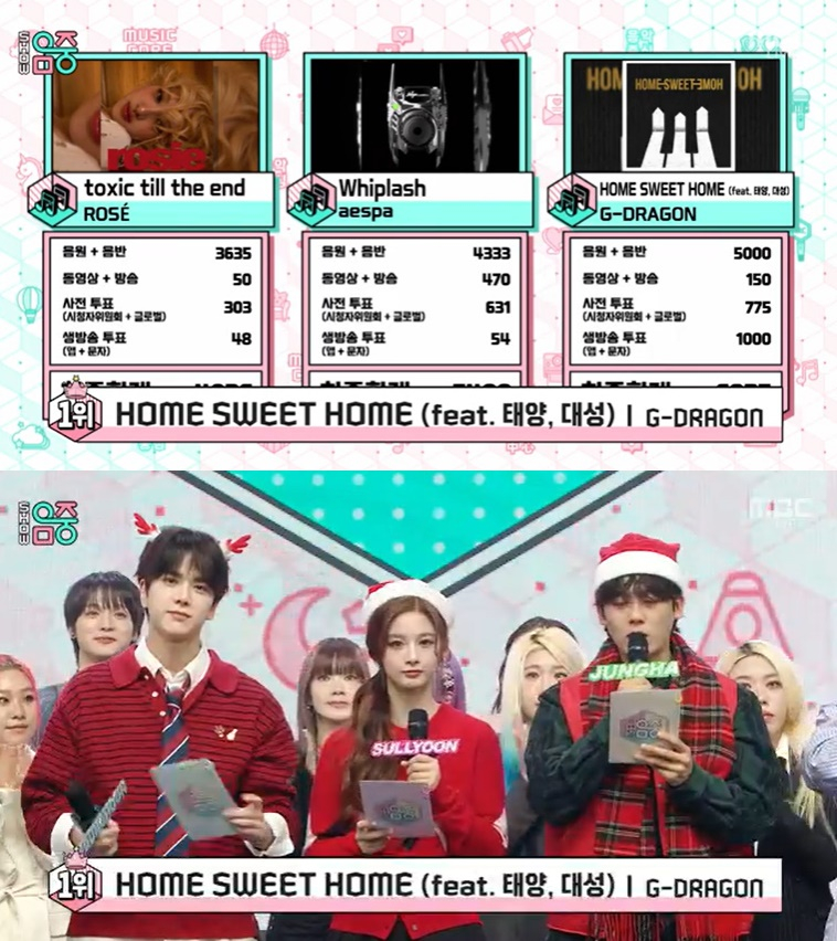 21일 오후 방송된 MBC 음악 프로그램 '쇼! 음악중심'(이하 '음중')에서는 지드래곤이 1위를 차지했다. 이날 12월 3주차 1위 후보로 로제 'toxic till the end', 에스파 'Whiplash', 지드래곤 'HOME SWEET HOME (feat. 태양, 대성)'이 올랐다.