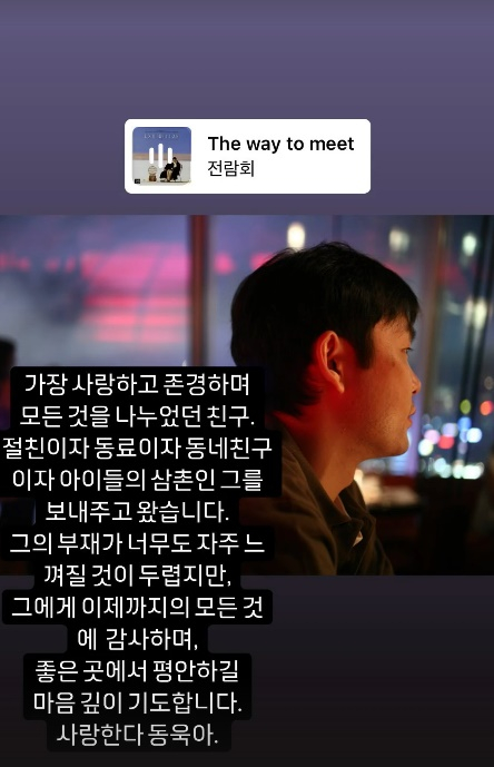 그는 이어 "그의 부재가 너무도 자주 느껴질 것이 두렵지만, 그에게 이제까지의 모든 것에 감사하며, 좋은 곳에서 평안하길 마음 깊이 기도합니다. 사랑한다 동욱아"라고 덧붙였다.