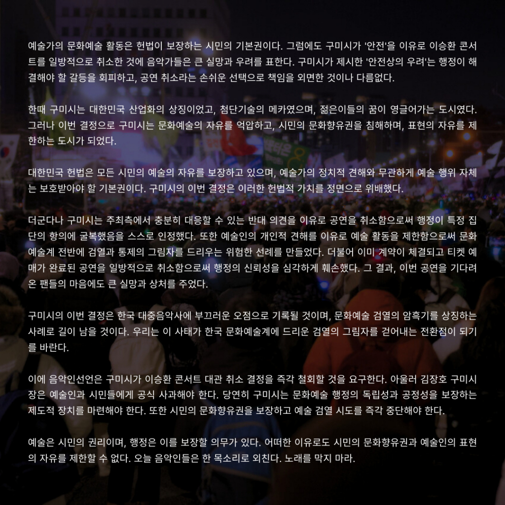 또한 "예술은 시민의 권리이며, 행정은 이를 보장할 의무가 있다"며 "어떠한 이유로도 시민의 문화향유권과 예술인의 표현의 자유를 제한할 수 없다. 오늘 음악인들은 한 목소리로 외친다. 노래를 막지 마라"고 목소리를 높였다.