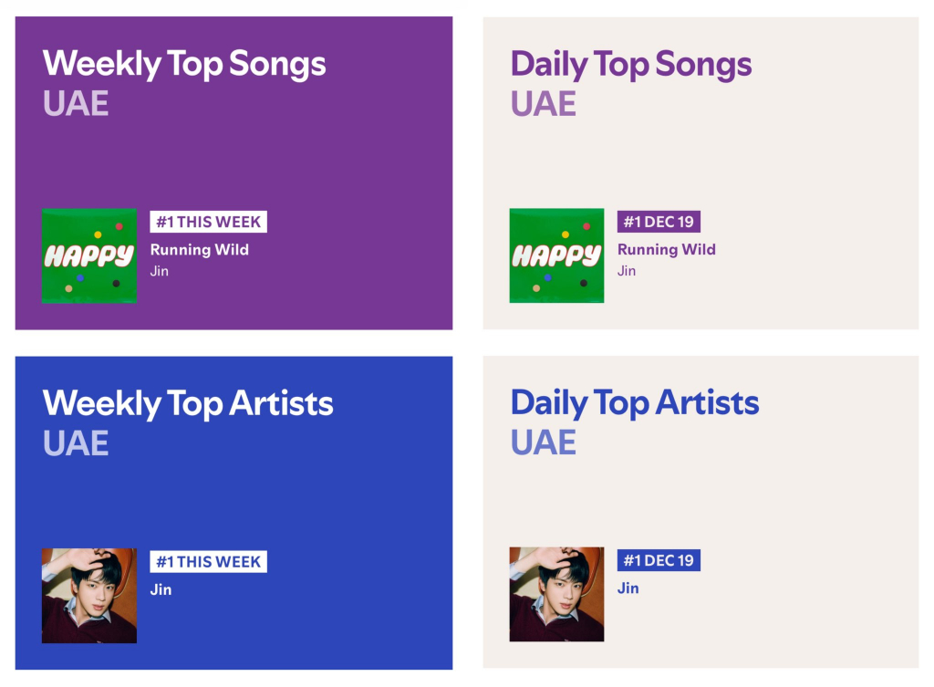 진은 세계 최대 음원 플랫폼 스포티파이(Spotify)에서 지난 20일(한국 시간) 발표된 UAE 주간 톱 송(Weekly Top Songs UAE), 주간 톱 아티스트 UAE(Weekly Top Artists UAE), 일간 톱 송 UAE(Daily Top Songs UAE), 일간 톱 아티스트 UAE(Daily Top Artists UAE)에서 모두 1위를 유지했다. 이로써 진은 5주 동안 이 모든 차트에서 1위를 차지하며 K팝 최고이자 유일한 기록을 가진 아티스트가 됐다.