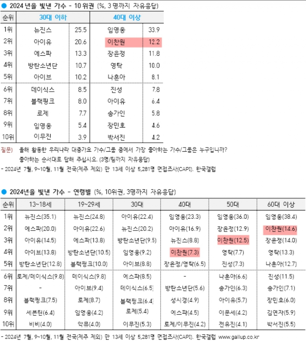 이찬원은 40대 이상에서 12.2%의 지지를 얻으며 '2024년을 빛낸 가수' 2위에 올랐다.
