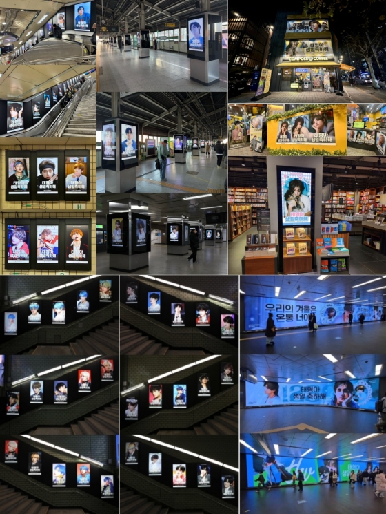 또 서울 지하철 3호선과 9호선 지하철 내부의 4448개 전체 스크린에 고화질 광고를 게재한다. 양 노선의 하루 이용자수 200만 명에게 일주일간 뷔의 생일 축하영상이 노출된다.