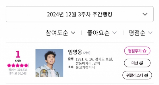임영웅은 12월 20일부터 12월 26일까지 집계된 12월 3주차 아이돌차트 평점랭킹에서 37만 4534표를 획득, 1위에 올랐다.