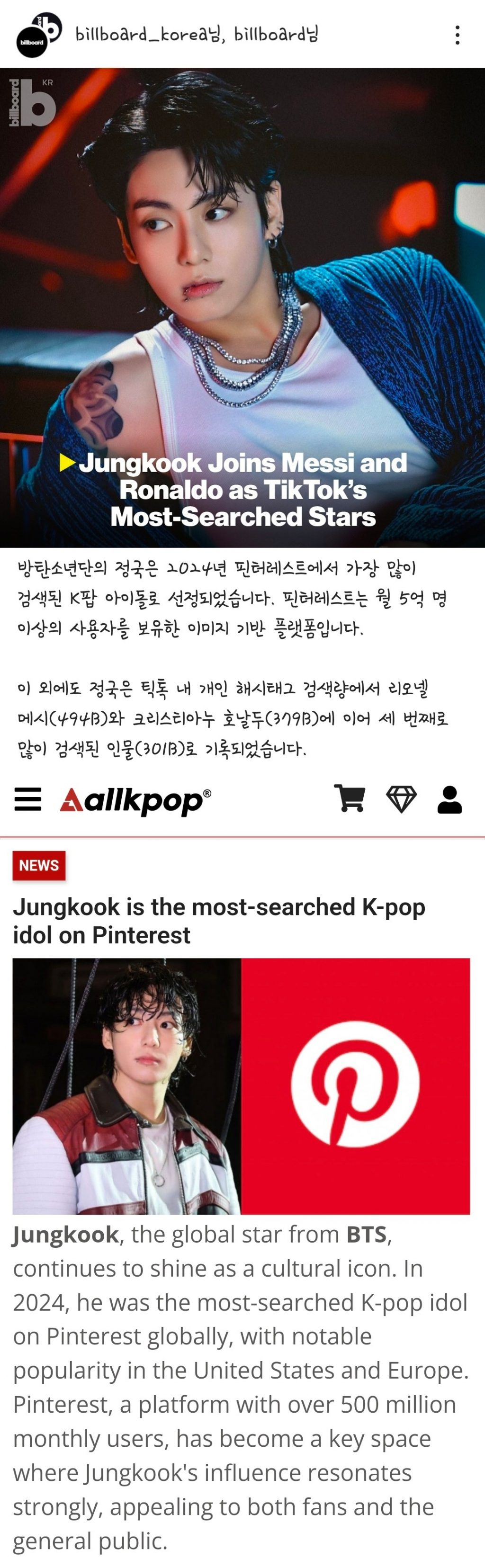 음악 전문 매체 '빌보드코리아'(Billboard Korea), 미국 매체 '올케이팝'(allkpop)은 공식 SNS 및 홈페이지를 통해 "정국이 2024년 핀터레스트에서 가장 많이 검색된 K-팝 아이돌이 됐다"고 전했다.