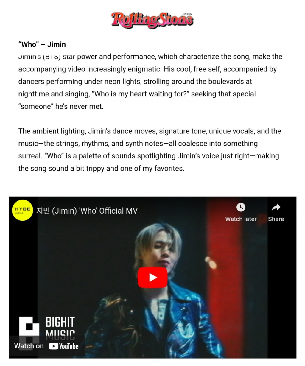 매체는 지민의 '후'에 대해 "이 노래는 지민의 스타 파워와 퍼포먼스로 더욱 특별하고 신비하다"고 극찬했다.