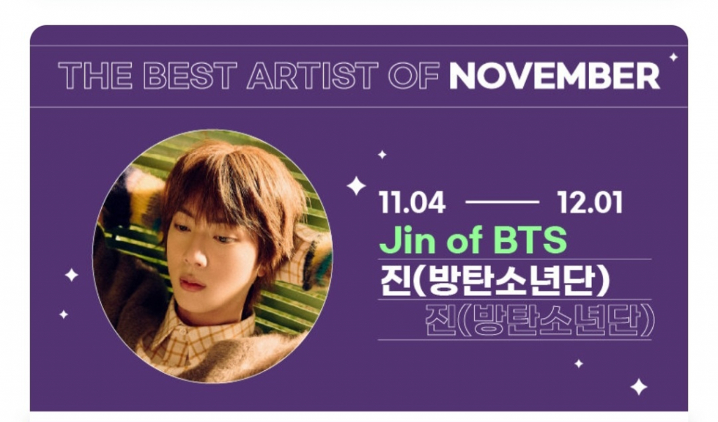 방탄소년단(BTS) 진이 아이돌픽(idolpick)에서 '11월의 베스트 아이돌'로 선정되며 인기를 빛냈다.