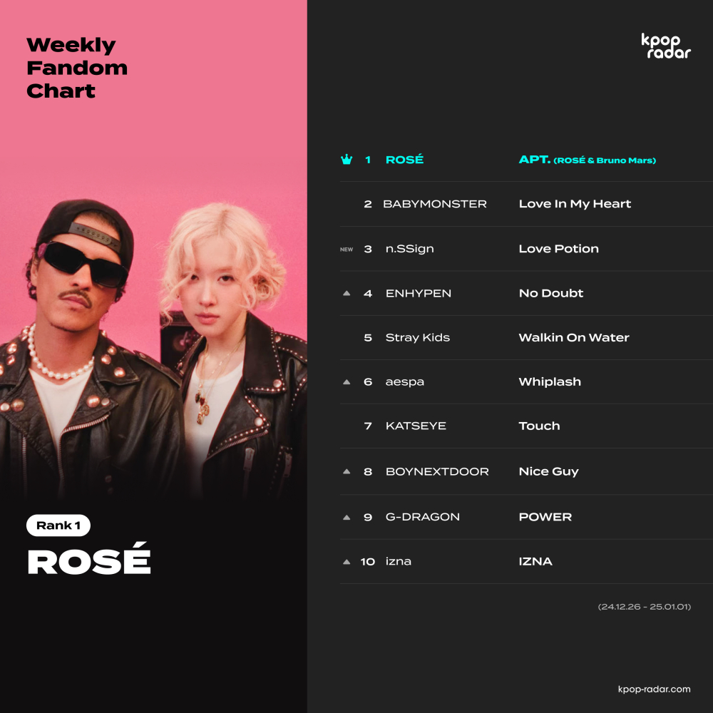 2일 발표된 케이팝레이더 위클리 팬덤 차트는 한 주간 아티스트의 성장세를 기반으로 작성된 증감률 차트로, 이번 주 로제는 세계적인 팝스타 브루노 마스(Bruno Mars)와 협업해 글로벌 음원 시장에서 돌풍을 일으킨 노래 '아파트(APT.)'로 다시 한번 정상에 등극했다.