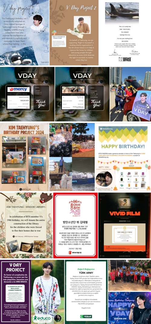 인도의 'Taehyung India'는 델리에 있는 동물 학대 근절협회에 동물 사료, 담요 등 보호소에 필요한 필수품을 기부했다. 튀르키예의 'sceneryforkthTR'는 담배, 술, 약물 및 도박 중독 등 다양한 중독과 싸우는 '터키 그린 크레센트 협회에 기부금을 전달했다.
