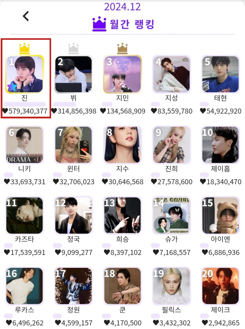 진은 '케이돌'에서 진행된 12월 월간랭킹에서 5억 7934만 377개의 하트를 얻어 압도적인 표수로 1위에 올랐다.