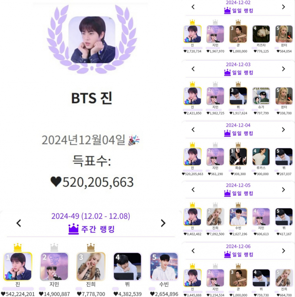 진은 생일인 12월 4일에 5억 2020만 5663개의 최고 하트수를 기록하며 월간 왕좌를 차지하는데 기여했다.
