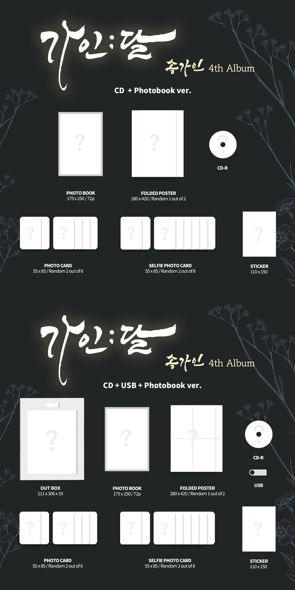 정규 4집 '가인;달' CD+Photobook 버전은 포토북과 포스터, 포토카드, 스티커, 셀피 포토카드가 담겨 구매 욕구를 높인다. 여기에 CD+USB+Photobook 버전에는 박스패키지와 USB가 추가로 구성돼 소장 가치를 더했다.