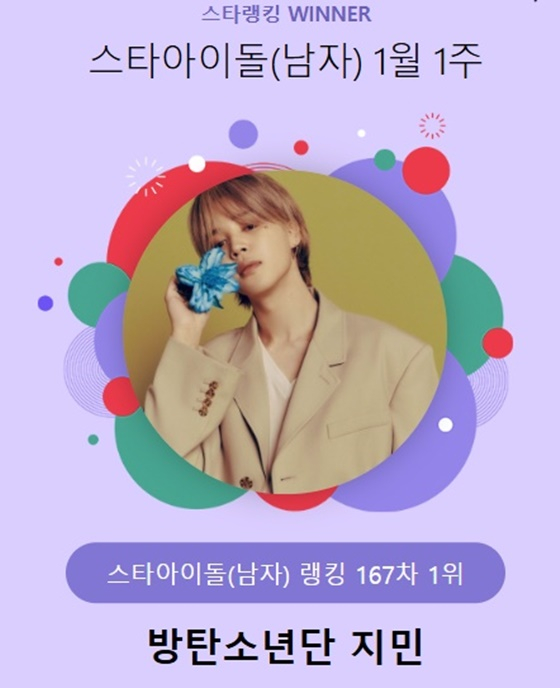 지민은 지난 2일 오후 3시 1분부터 9일 오후 3시까지 진행된 1월 1주(167차) 스타랭킹 스타아이돌 남자 부문 랭킹 투표에서 1위에 올랐다.