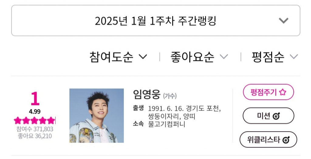 연예K-POP임영웅, 아이돌차트 평점랭킹 198주 연속 1위발행 : 2025.01.10 ・ 07:11문완식 기자가수 임영웅이 아이돌차트 평점랭킹 198주 연속 1위에 오르며 인기를 빛냈다.임영웅은 1월 1주차 아이돌차트 평점랭킹에서 37만 1803표를 얻어 1위를 차지했다.이로써 임영웅은 아이돌차트 평점랭킹에서 198주 연속 1위에 오르게 됐다.스타에 대한 실질적인 팬덤의 규모를 가늠할 수 있는 '좋아요'에서도 임영웅은 가장 많은 3만 6210개를 받았다.<저작권자 © 스타뉴스, 무단전재 및 재배포 금지>브리핑요약 없이도 가볍게 읽으실 수 있는 짧은 뉴스입니다.추천 기사문완식 기자기자홈좋아요연예-K-POP의 인기 급상승 뉴스연예-K-POP의 최신 뉴스
