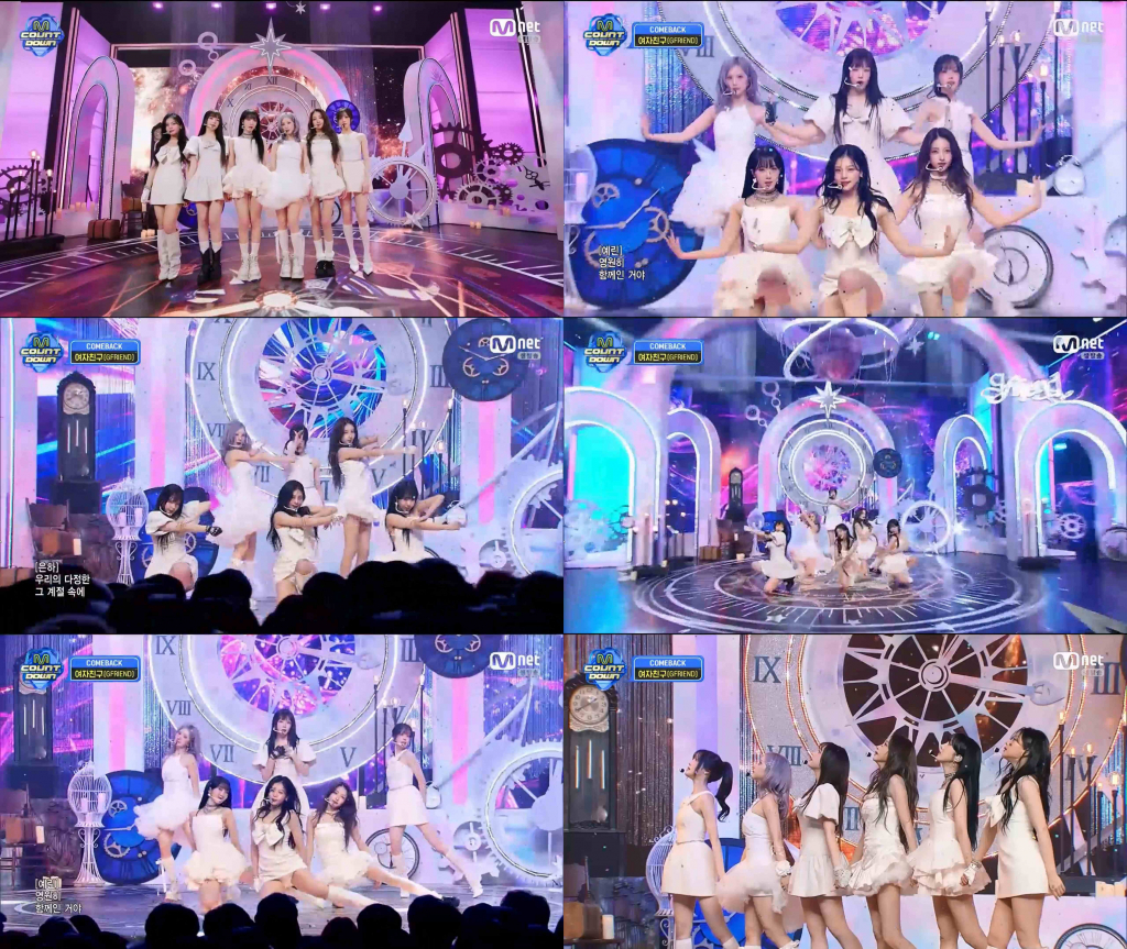여섯 멤버는 스페셜 앨범의 타이틀곡 '우리의 다정한 계절 속에 (Season of Memories)'를 선보였다. 이날 세트는 유리구슬과 시곗바늘 등 팀을 상징하는 요소들로 꾸며져 의미를 더했다. 흰 원피스 차림으로 등장한 멤버들은 '칼군무 대표주자'다운 무대를 펼쳤다. 쉴 틈 없이 바뀌는 동선과 시원시원하게 뻗는 동작, 어느 방향에서 봐도 흐트러짐 없는 팔과 다리의 각도가 감탄을 자아냈다.