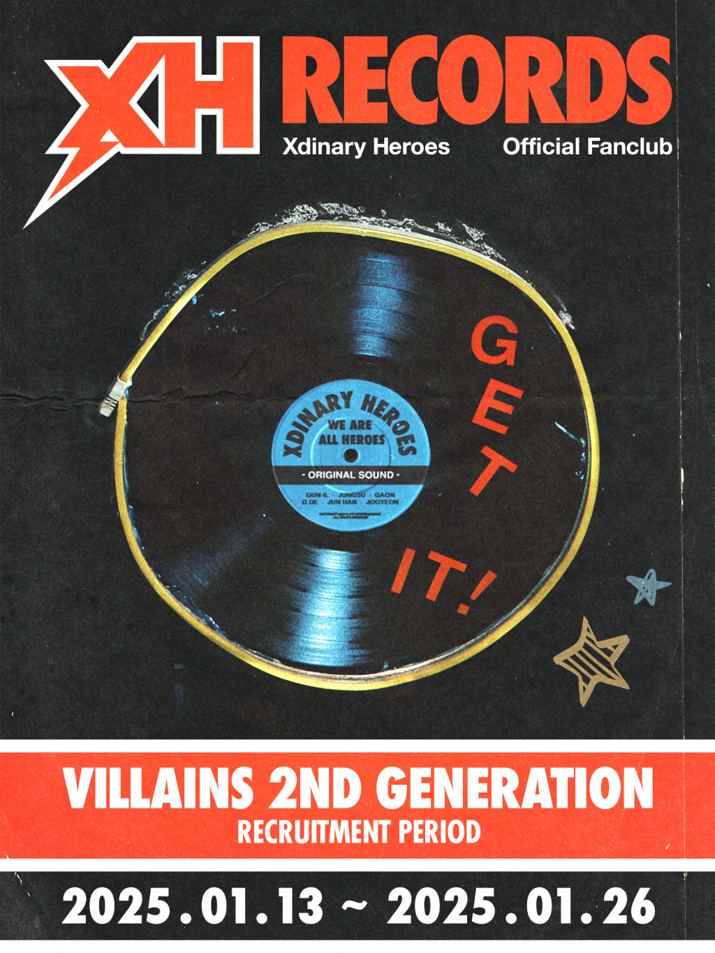 공개된 이미지는 LP판 위 건일, 정수, 오드(O.de), 가온, 준한(Jun Han), 주연의 이름과 "GET IT"이라는 문구가 더해져 키치한 분위기를 자아낸다. 메시지 'XH RECORDS'로는 엑스디너리 히어로즈와 빌런즈가 함께 채워갈 추억에 대한 기대를 높였다.
