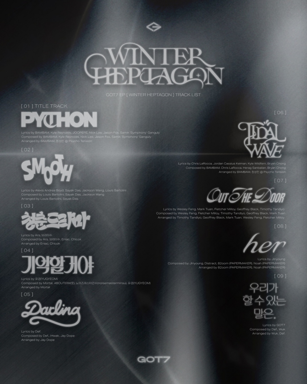 갓세븐은 3년 만에 선보이는 완전체 앨범 'WINTER HEPTAGON'에서 음악적인 역량과 성장을 모두 보여주며 반가움을 넘어선 다채로운 볼거리, 들을 거리를 선사할 예정이다. 이에 앨범 전반 구석구석에 멤버들의 따뜻한 애정과 손길이 묻어나는 트랙리스트가 글로벌 음악 팬들의 눈길을 사로잡고 있다.