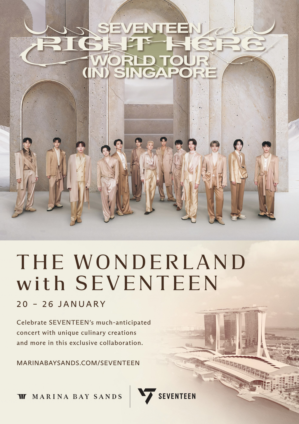 '더 원더랜드 위드 세븐틴'은 세븐틴이 세계적인 럭셔리 리조트 마리나 베이 샌즈와 협업해 화려한 조명 쇼와 유명 F&B 브랜드의 특별 메뉴를 선보이는 행사다. 25~26일 싱가포르 내셔널 스타디움에서 'SEVENTEEN [RIGHT HERE] WORLD TOUR IN ASIA'가 개최되는 만큼, 공연을 보러 온 관객들과 전 세계 관광객들에게 새로운 즐거움을 안길 예정이다.