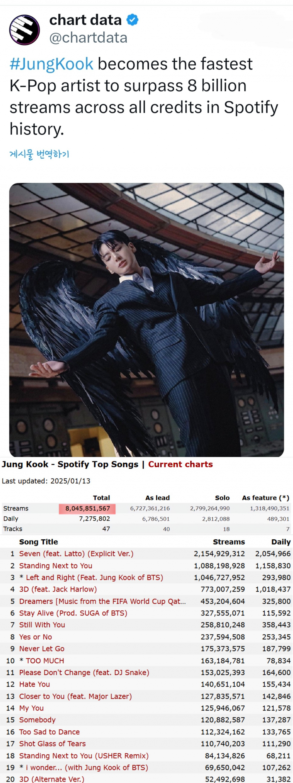 이와 함께 정국은 아시아 솔로 가수 최초로 스포티파이 10억 이상 스트리밍 곡 통산 3개(Seven, Left and Right, Standing Next to You)도 보유하고 있다.