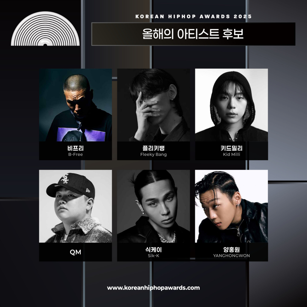 '올해의 아티스트' 부문에는 비프리, 플리키뱅, 키드밀리, QM, 식케이, 양홍원이 후보로 선정됐다. 'KHA 2025' 최종 투표는 오는 1월 15일부터 21일까지 진행될 예정이다.