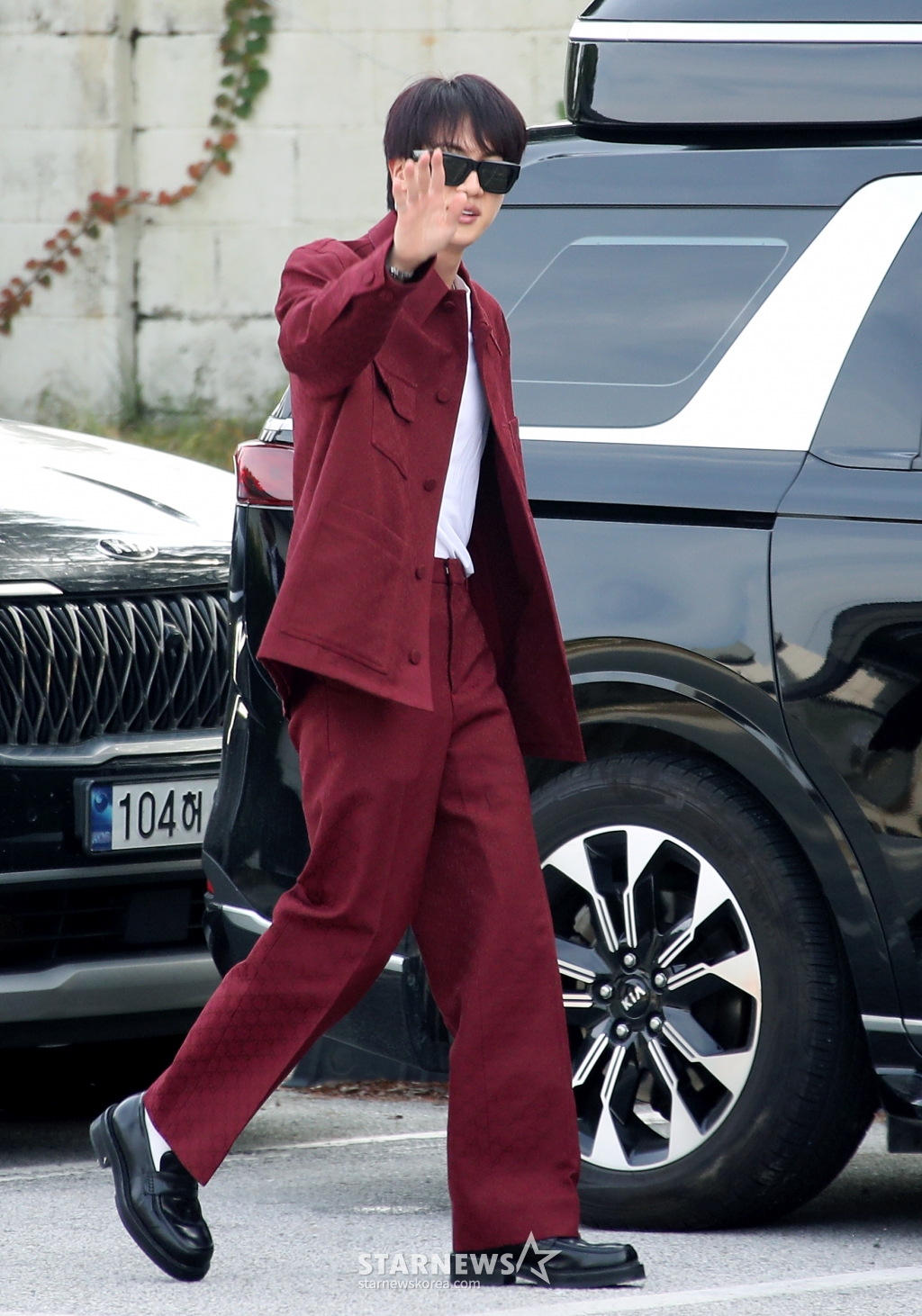 (원주=뉴스1) 권현진 기자 = 방탄소년단(BTS) 진이 17일 강원도 원주시에 위치한 육군 제36보병사단 백호 신병교육대에서 인사를 하고 있다. 2024.10.17./뉴스1 Copyright (C) 뉴스1. All rights reserved. 무단 전재 및 재배포, AI학습 이용 금지. /사진=(원주=뉴스1) 권현진 기자